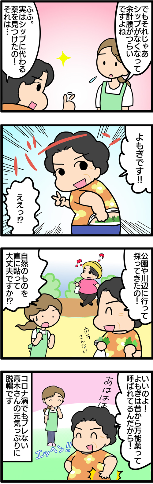 すると、「公園や近所の山の端まで行ってよもぎを採ってるよ」と意気揚々と教えてくれました。よもぎ?お餅に入っているよもぎしか知らない私がキョトンとしていると、「ホレ、これだよ」とシャツをめくって腰を見せてくれました。見ると腰に巻かれた緑の葉っぱが。