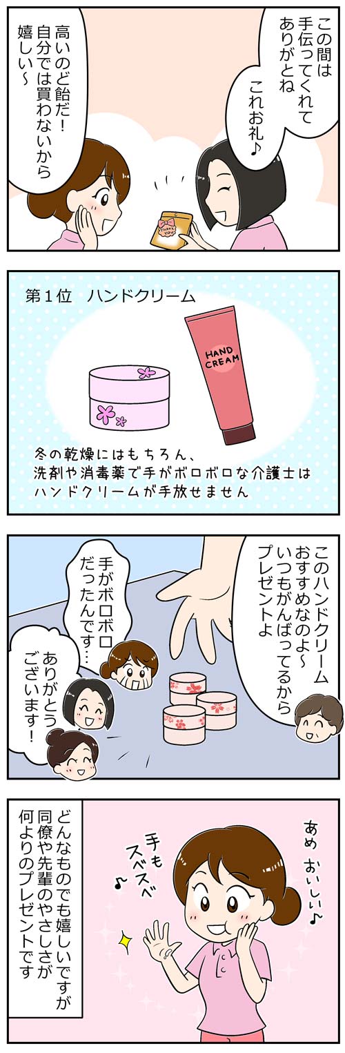 個人的にはハンドクリームがダントツでおすすめ。私はもらって一番嬉しいものかもしれません。