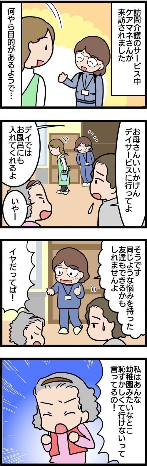 「デイは賑やかでいいですよ」「同じような悩みを持った方がいるかもしれませんよ」と穏やかに説得するケアマネさん。しかし利用者さんはなかなかに頑固です。