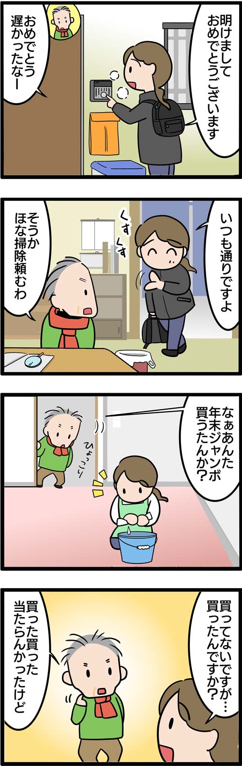 その後も掃除をしている私に、とぎれとぎれに話しかけてくれました。年末ジャンボや箱根駅伝、お笑い番組などの他愛のない話です。