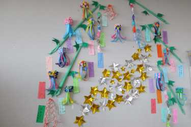 7月の壁面制作を行いました。七夕の短冊に皆様のお願いごとを込めて飾らせて頂きました。「メロン・ウナギをいっぱい食べたから、七夕様足(の調子)を良くして下さい。」とお願いする利用者様もいました。